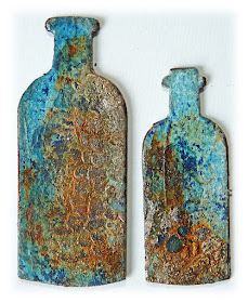 The bottles were die-cut from chipboard (greyboard) and given a coat of white gesso. From there I used mask and peel, black modelling paste with a stencil, paints and metallic lustre to get these final effects
